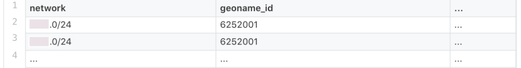 If we had the network X.Y.Z.0/24 that would mean “every IP that starts with X.Y.Z. and has any number between 0 and 255 at the end. In other words, any IP between X.Y.Z.0 and X.Y.Z.255. So if we observed a user with the IP X.Y.Z.95, that would fall in the network X.Y.Z.0/24 and thus is located in geoname_id of 6252001. A subnet mask can be any number between 1 and 32 and the smaller the number, the wider the network.